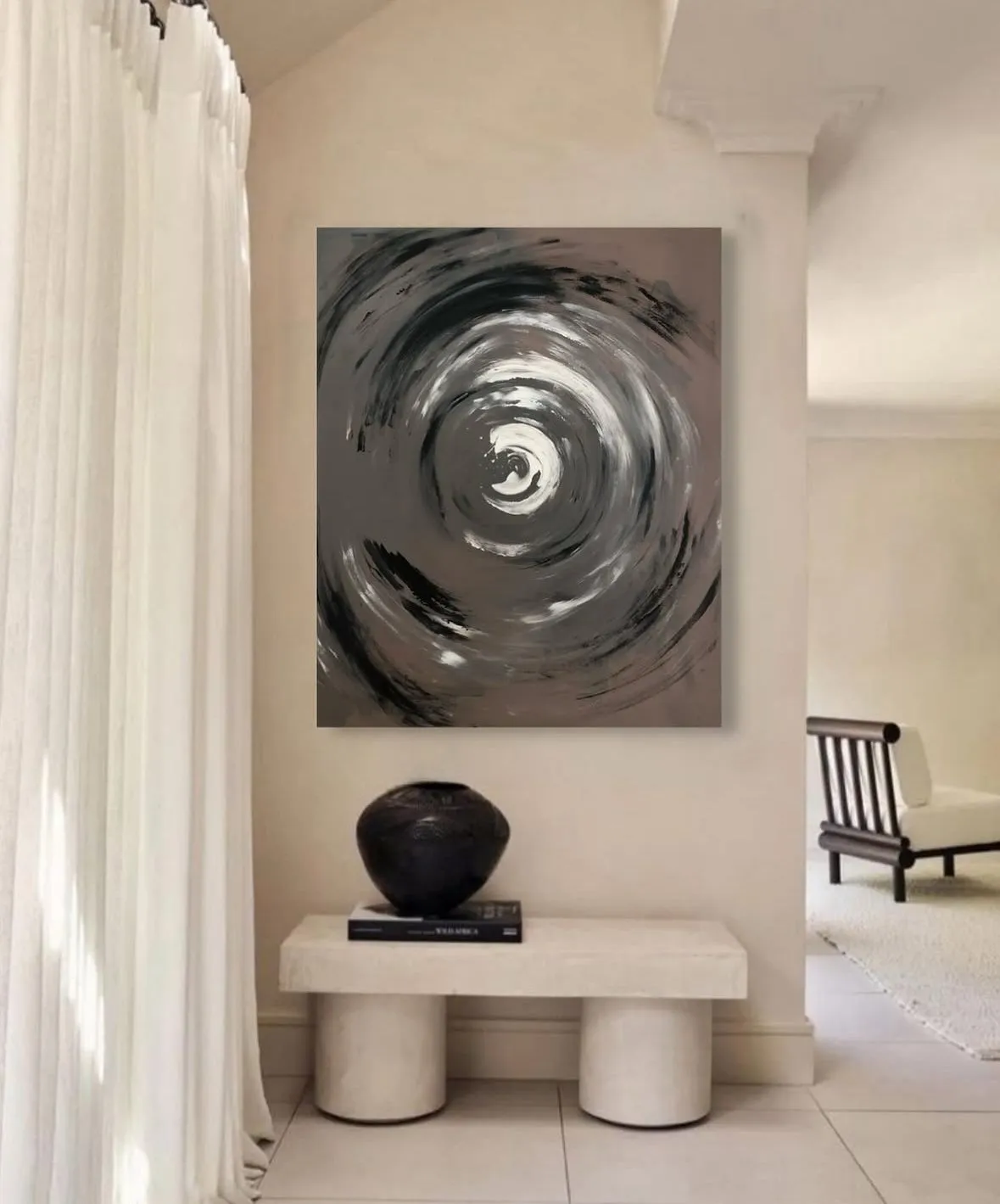 ”Döngü.No2” isimli tablo akrilik boya ve dokunun bir harmonisinden oluşur.